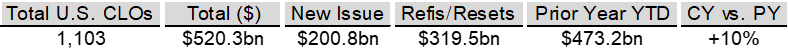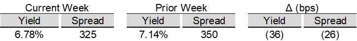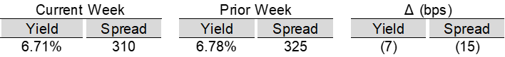 High yield bond yields decreased 8bps to 6.62% and spreads decreased 5bps to 300bps. Leveraged loan yields decreased 3bps to 7.86%, while spreads remained unchanged at 455bps. WTD high yield bond returns were positive 28bps. WTD leveraged loan returns were positive 15bps. 10yr treasury yields increased 4bps to 4.17%. High yield and leveraged loans were up this week, supported by strong macro momentum as US jobless claims declined, reinforcing risk appetite.