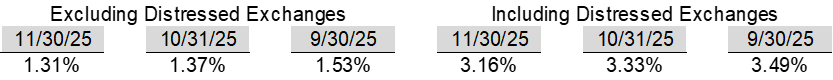 - Most recent defaults include: New Fortress Energy ($3.5bn, 11/15/2025), Packers Sanitation Services ($1.2bn, 11/5/2025), Office Properties Trust ($1.7bn, 10/31/25), GPS Hospitality ($400mn, 10/30/25), Jordan Health Services ($1.0bn, 10/15/25), Astra Acquisition ($1bn, 9/30/25), First Brands ($4.4bn, 9/29/25), Spirit Airlines ($852mn, 8/29/25), ModivCare ($1.1bn, 8/20/25), Anastasia Beverly Hills ($606mn, 8/11/25), Claire’s Stores ($506mn, 8/6/25).