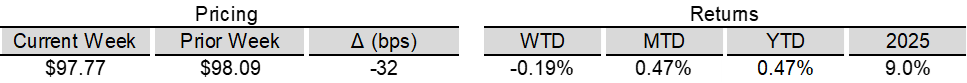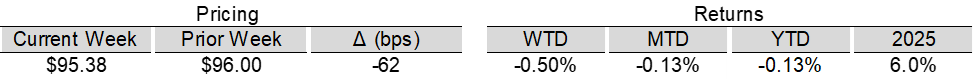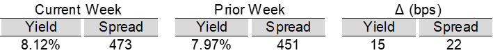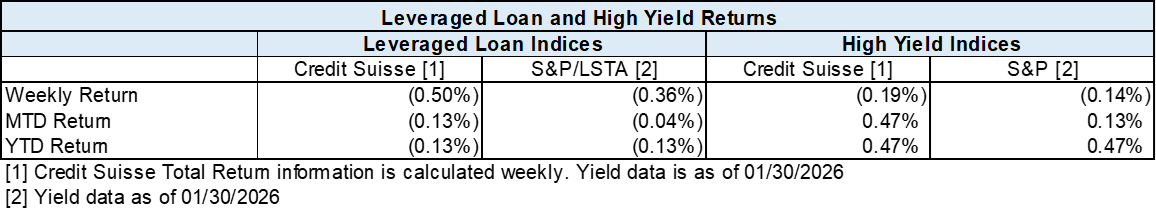 High yield bond yields increased 14bps to 6.71% and spreads widened 18bps to 300bps. Leveraged loan yields increased 15bps to 8.12% while spreads increased 22bps to 473bps. WTD high yield bond returns were negative 19bps. WTD leveraged loan returns were negative 50bps. 10yr treasury yields decreased 2bps to 4.23%. High yield bond spreads moved wider from post-GFC tights amid the Fed decision, earnings updates, sector dispersion, a lighter primary calendar, and Fed Chair nomination headlines. Leveraged loan prices declined as accelerating losses in the Software subsector, combined with a heavy supply and repricing backdrop, weighed on the market.
