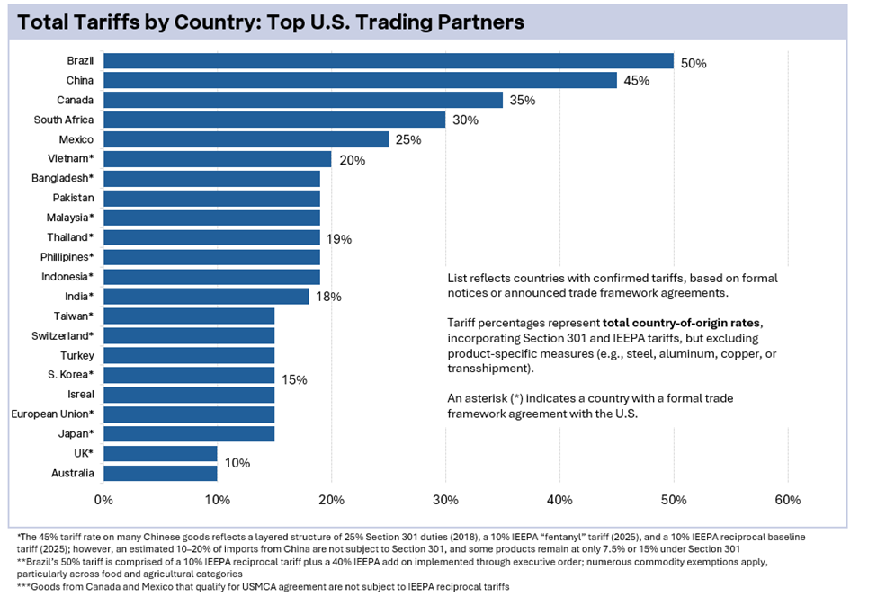 - The U.S. and Taiwan finalized their trade deal that confirms a 15 % U.S. tariff rate on Taiwanese imports while Taiwan cuts or eliminates tariffs on most U.S. goods. Taiwan also pledged substantial purchases of U.S. LNG, crude, aircraft, and industrial equipment, and major investment in U.S. semiconductor/AI sectors under the pact