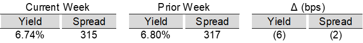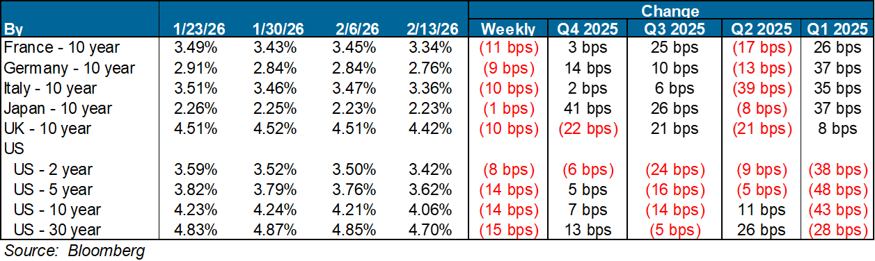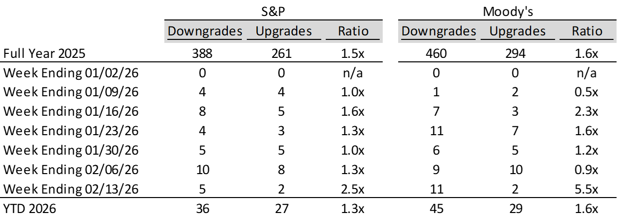 High yield bond yields decreased 6bps to 6.74% and spreads tightened 2bps to 315bps. Leveraged loan yields decreased 5bps to 8.16% while spreads were unchanged at 491bps. WTD high yield bond returns were positive 22bps. WTD leveraged loan returns were positive 12bps. 10yr treasury yields decreased 11bps to 4.10%. High yield and leveraged loans gained modestly this week, despite underperformance in lower-rated credits and widening in AI-sensitive sectors such as software and insurance brokers amid ongoing disruption concerns.