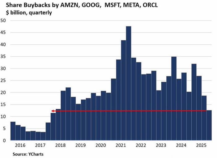 - Combined buybacks by Amazon, Alphabet, Microsoft, Meta, and Oracle fell to $12.6B in Q4 2025, the lowest since 2018 and down 74% from the ~$48B peak in 2021.