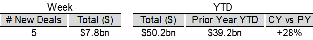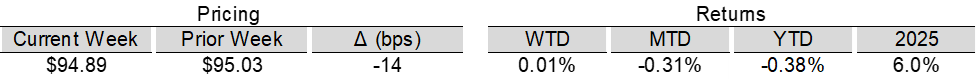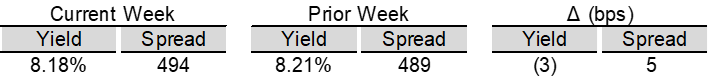 High yield bond yields increased 1bp to 6.71% and spreads widened 9bps to 313bps. Leveraged loan yields decreased 3bps to 8.18% while spreads increased 5 bps to 494bps. WTD high yield bond returns were positive 4bps. WTD leveraged loan returns were positive 1bps. The 10yr treasury yield decreased 3bps to 4.07%. High yield spreads edged wider following hawkish FOMC minutes, though solid earnings and firmer manufacturing data helped temper the move. Leveraged loans posted modest gains, supported by light issuance and continued modest inflows, despite ongoing weakness in software credits.