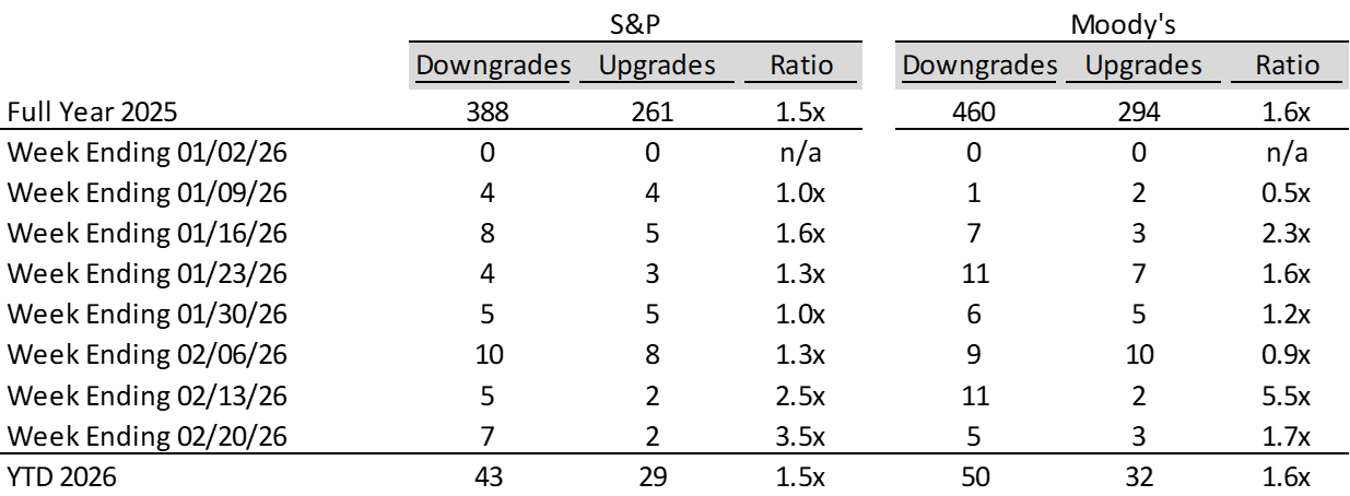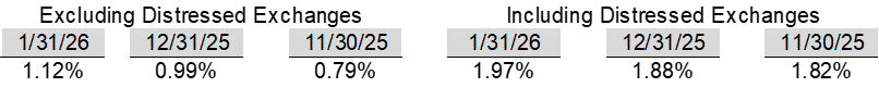 Most recent defaults include: Trinseo ($390mn, 02/17/2026), Beasley Broadcasting Group ($189mn, 02/01/2026), Nine Energy Service ($300mn, 02/01/2026), Multi-Color ($4.5bn, 01/29/2026), Pretium Packaging ($201mn, 01/28/2026), Saks Global Enterprises ($2.7bn, 12/30/2025), United Site Services ($2.6bn, 11/30/2025), New Fortress Energy ($3.5bn, 11/15/2025), Packers Sanitation Services ($1.2bn, 11/5/2025), and Office Properties Trust ($1.7bn, 10/31/25).