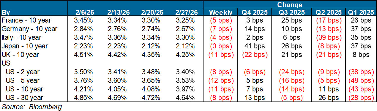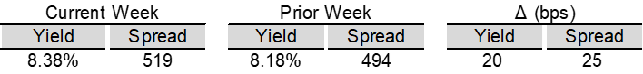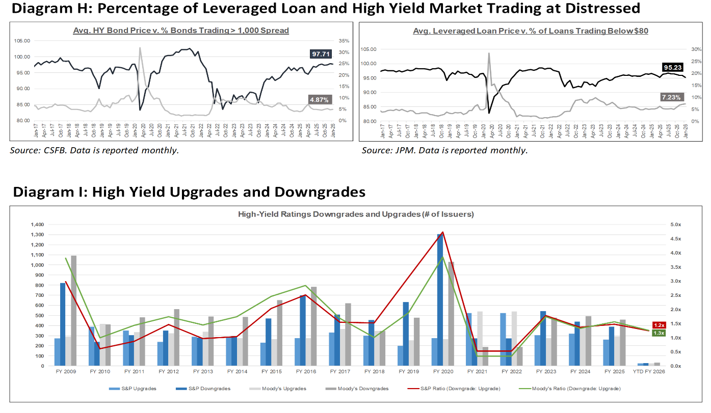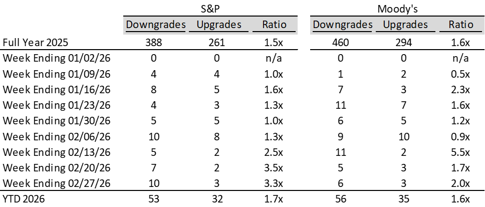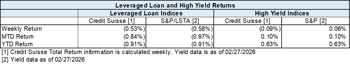 High yield bond yields increased 13bps to 6.80% and spreads widened 13bps to 326bps. Leveraged loan yields increased 20bps to 8.38% while spreads increased 25 bps to 519bps. WTD high yield bond returns were negative 9bps. WTD leveraged loan returns were negative 53bps. 10yr treasury yields decreased 6bps to 4.02%. High yield spreads widened to YTD highs this week amid ongoing concerns about AI-related disruption risks. Leveraged loans recorded their largest weekly loss since Liberation Day, alongside the largest retail outflows since April 2025 and continued weakness in AI-exposed sectors.