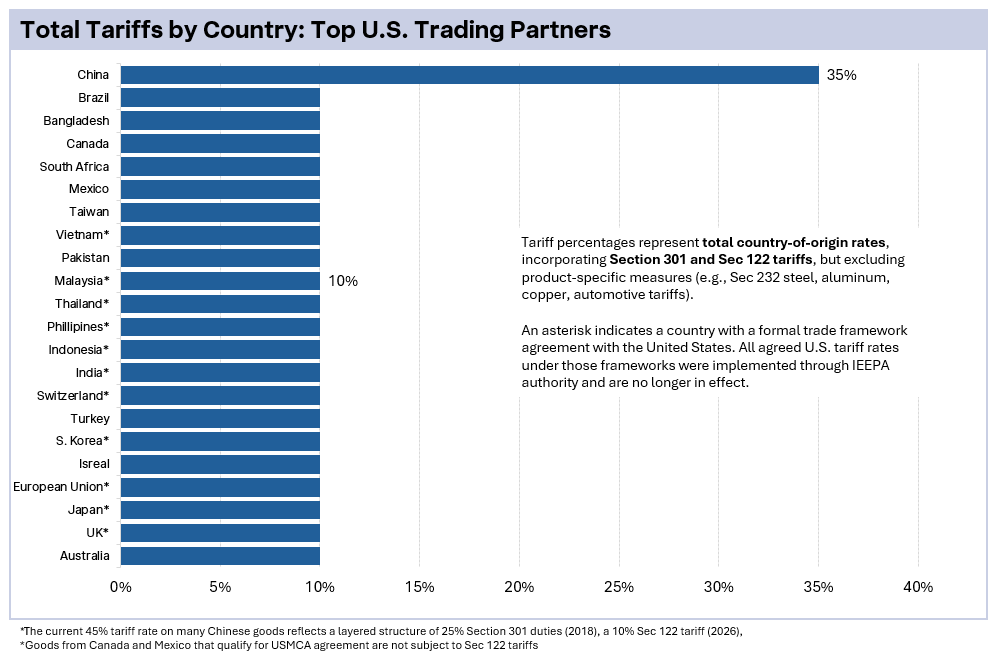 - Although President Trump publicly referenced implementing Section 122 tariffs at 15% on all countries, U.S. Customs and Border Protection operationalized the measure through a CSMS message establishing a 10 percent duty rate effective February 28 at 12:01 a.m.