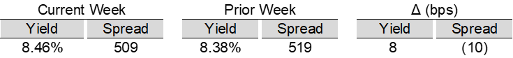 High yield bond yields decreased 7bps to 6.71% and spreads decreased 15bps to 310bps. Leveraged loan yields were unchanged at 7.85% and spreads decreased 5bps to 458bps. WTD high yield bond returns were positive 31bps. WTD leveraged loan returns were positive 20bps. 10yr treasury yields increased 11bps to 4.11%. High yield and leveraged loan spreads tightened this week amid mixed macro data, including strong PMIs, softer ADP readings, and steady jobless claims, while inflows continued to accelerate in high yield.