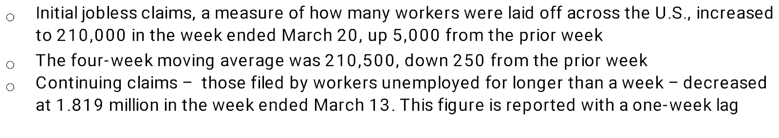 - Continuing claims - those filed by workers unemployed for longer than a week - increased at 1.841 million in the week ended March 20. This figure is reported with a one-week lag.