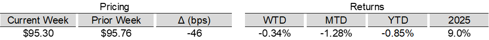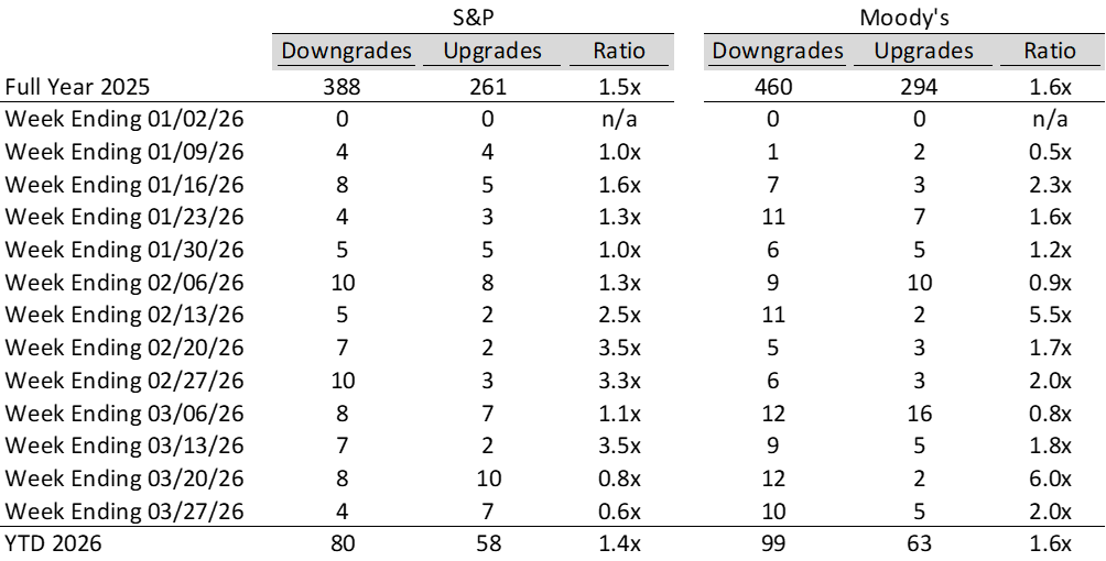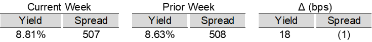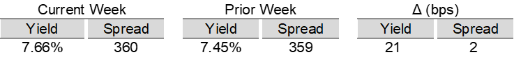 High yield bond yields increased 21bps to 7.66% and spreads widened 2bps to 360bps. Leveraged loan yields increased 18bps to 8.81% while spreads decreased 1bps to 507bps. WTD high yield bond returns were negative 34bps. WTD leveraged loan returns were positive 16bps. 10yr treasury yields increased 13bps to 4.41%. High yield bond yields increased amid elevated geopolitical uncertainty in the Middle East, a rising interest rate environment, and continued retail outflows. Leveraged loan prices increased slightly, supported by a modest return of retail inflows and a pickup in new issuance activity.