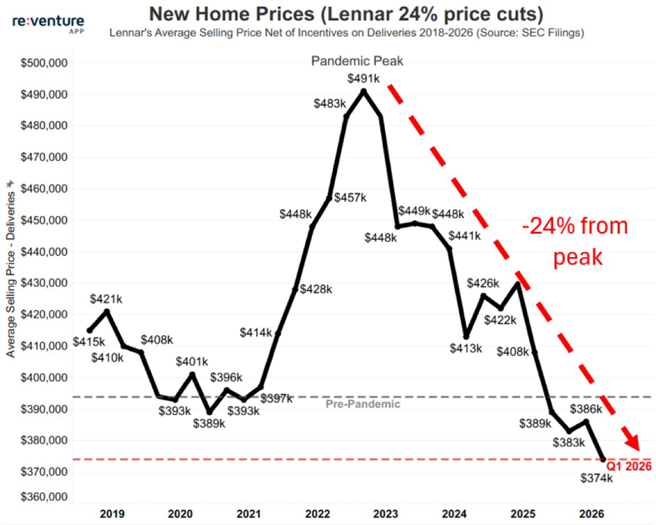 - Price cuts accelerating. Lennar’s average new home price has fallen 24% from its $491k pandemic peak to $374k in Q1 2026, below pre-pandemic levels and the lowest in over a decade.