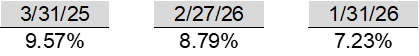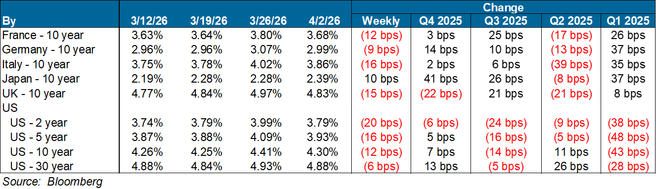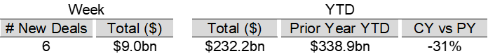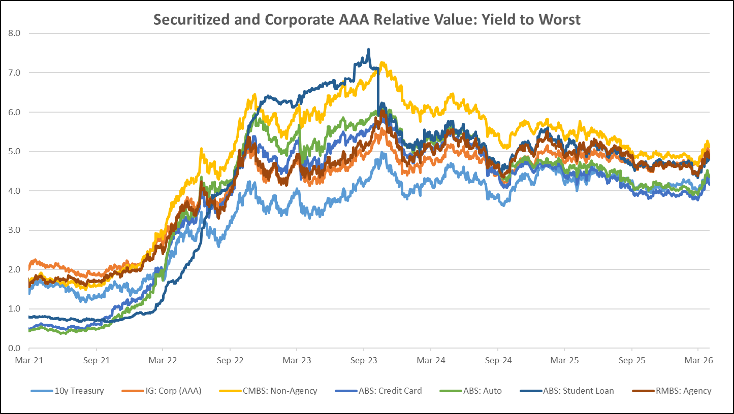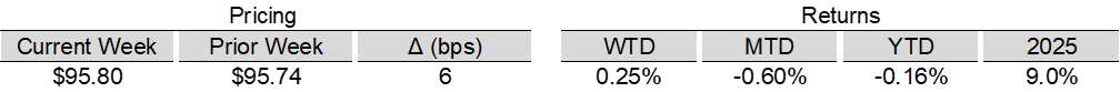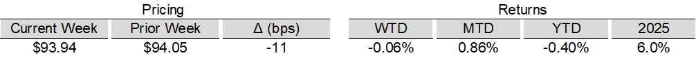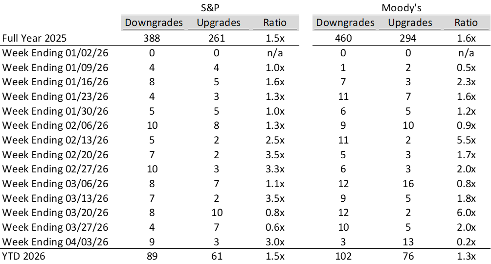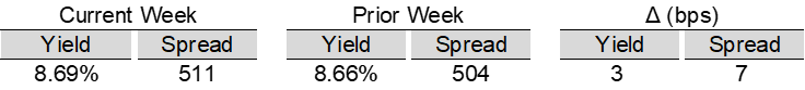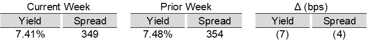 High yield bond yields decreased 7bps to 7.41% and spreads tightened 4bps to 349bps. Leveraged loan yields increased 3bps to 8.69% and spreads increased 7bps to 511bps. WTD high yield bond returns were positive 25bps. WTD leveraged loan returns were negative 6bps. 10yr treasury yields decreased 12bps to 4.30%. High yield bond yields decreased supported by stronger domestic economic data, despite ongoing retail outflows. Leveraged loan spreads widened amid escalating Middle East uncertainty, with conflict contributing to increased inflation pressures.