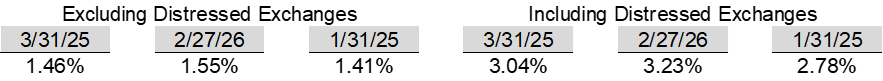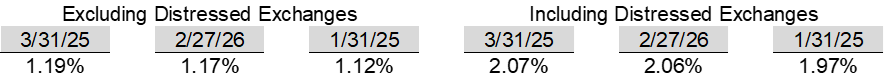 Most recent defaults include: Cumulus Media ($641mn, 03/05/2026), Trinseo ($390mn, 02/17/2026), Beasley Broadcasting Group ($189mn, 02/01/2026), Nine Energy Service ($300mn, 02/01/2026), Multi-Color ($4.5bn, 01/29/2026), Pretium Packaging ($201mn, 01/28/2026), Saks Global Enterprises ($2.7bn, 12/30/2025), United Site Services ($2.6bn, 11/30/2025), and New Fortress Energy ($3.5bn, 11/15/2025).