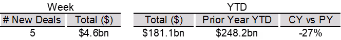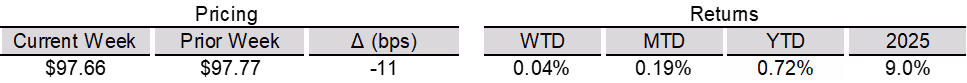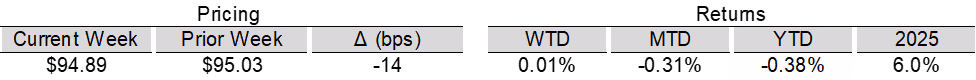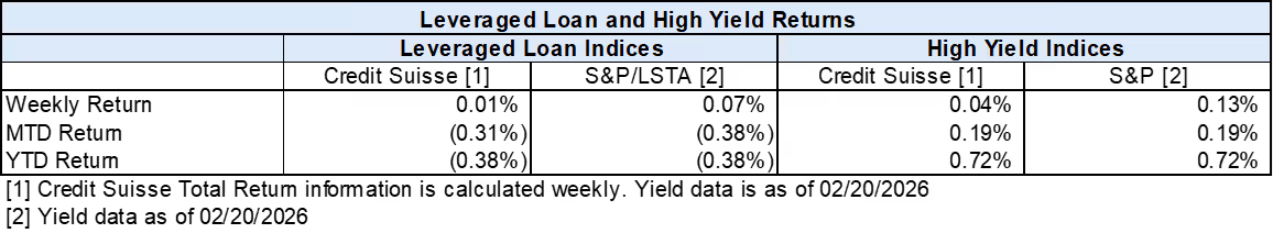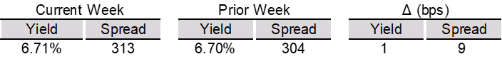 High yield bond yields increased 1bp to 6.71% and spreads widened 9bps to 313bps. Leveraged loan yields decreased 3bps to 8.18% while spreads increased 5 bps to 494bps. WTD high yield bond returns were positive 4bps. WTD leveraged loan returns were positive 1bps. The 10yr treasury yield decreased 3bps to 4.07%. High yield spreads edged wider following hawkish FOMC minutes, though solid earnings and firmer manufacturing data helped temper the move. Leveraged loans posted modest gains, supported by light issuance and continued modest inflows, despite ongoing weakness in software credits.